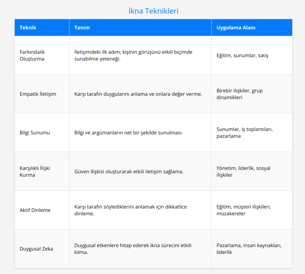 İletişim, insan ilişkilerinde temel bir unsur olarak öne çıkar. İkna, bu sürecin önemli bir parçasını oluşturur. İkna teknikleri ise etkili iletişimi sürdürebilmek için gereklidir.