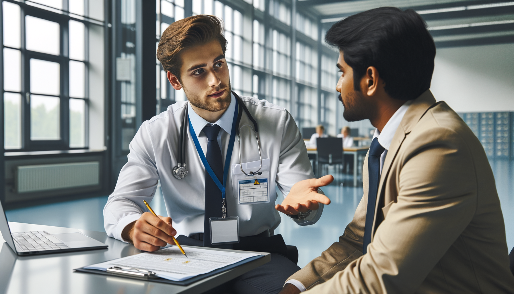 Bu diyalogda, iş sağlığı uzmanlarının günlük iş yaşamlarında karşılaşabilecekleri bir durum örneklendirilmiştir.